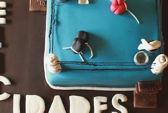 También modele dos pares de guantes, en rojo y negros que quedaron colocados mas al Centro.La mayor dificultad se presento en las cuerdas del Ring,deseche rápidamente la opción de la glasa a punto fuerte por la distancia entre las esquinas y hacerlas en pasta de goma, las dejo excesivamente rígidas con el consiguiente riesgo de rotura en el transporte de la tarta.