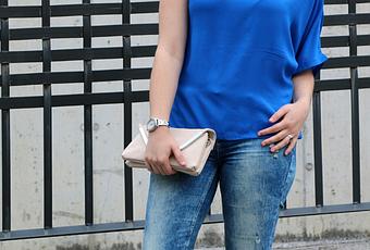Hoy un look sencillo pero potente. He decidido ponerme mi camiseta azul klein asimétrica con jeans desgastados y unas buenas sandalias. Además lo he combinado con un bolso color claro acorde al calzado. Me encantan este tipo de looks super sencillos pero con mucha fuerza. ¿Qué os parece?