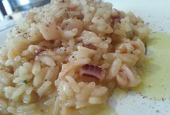 Ingredientes para 2 personas:180 gr. de arroz, 2 calamares, 1/3 de cebolla, caldo vegetal, brandy, azafrán, pimienta, mantequilla, sal y aceite.