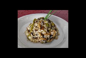 Limpiar y lavar los espárragos, córtalos a trozos.Lavar y picar la cebolla tierna, picar los dientes de ajos.Limpiar las setas con un paño o papel de cocina procurando no mojarlas, cortar la base desechable y hacer trozos.Los espárragos como las setas pueden se congeladas o de frasco. Pero esta receta se preparó todo fresco, con lo que hay mejor sabor.
