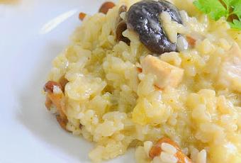 Picamos la cebolleta y la pochamos con un chorrito de aceite de oliva, cocinamos hasta que pochada. Añadimos las setas y el pollo troceado, cocinamos unos minutos, añadimos el arroz y la pastilla de caldo.