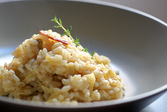 Por un lado sofreímos el bacon cortado en tiritas en una sartén con un poco de orégano hasta que nos quede crujiente y reservamos. No hace falta añadir aceite, ya que el bacon suelta mucha grasa. Por otro lado, en una cacerola, sofreímos el puerro bien picado con una cucharada de mantequilla. Cuando este doradito agregamos las alcachofas y damos un par de vueltas. Entonces incorporamos el vaso de vino y dejamos que reduzca el alcohol. Esto potencia los sabores y aporta ciertos aromas característicos del vino. Después echamos el arroz y comenzamos a remover. Poco a poco, sin dejar de darle vueltas al arroz, vamos añadiendo caldo, que lo deberíamos tener caliente en otro cazo, para, de ese modo, no cortar la cocción del arroz. Vamos probando el arroz, y cuando esté en su punto, echamos el último cucharón de caldo junto con un buen puñado de queso rallado. Probamos de sal y de pimienta y apartamos del fuego.