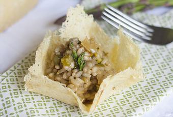 Risotto de espárragos al Pedro Ximenez sobre vaso de queso crujiente
