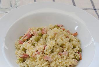 Ingredientes:- 150 gramos de bacon.- 150 gramos de guisantes (pueden ser congelados o normales)- 250 gramos de pasta (ella utiliza una que se llama Orzo, yo utilicé una que se llama Pepita de melón).- Aceite.- Agua hirviendo.- Una cucharadita de mantequilla
