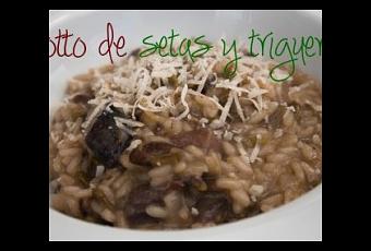 Después de 10 minutos de cocer y remover, incorporamos los trigueros reservados, las setas rehogadas y seguimos agregando cucharadas de caldo hasta que el arroz esté al dente.