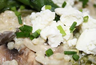 A continuación añadimos el arroz, removemos y añadimos un poco de agua o caldo de verduras si tenemos. Para hacer el risotto meloso hay que ir añadiendo el líquido poco a poco, cada ratito un poco y sin que llegue a cocer fuerte, así añadiremos el agua o caldo, el vino y la nata. A media cocción aproximadamente añadimos los espárragos cortados en trocitos (podemos guardar 2 o 3 cabezas de espárragos para decorar) y los champiñones limpios y cortados en láminas. Removemos y seguimos añadiendo caldo según requiera el arroz. Al final de la cocción (que en todas partes hablan de unos 20 min de cocción del arroz pero que a mi me parece que son unos 35 o más) añadimos el queso de cabra y removemos.