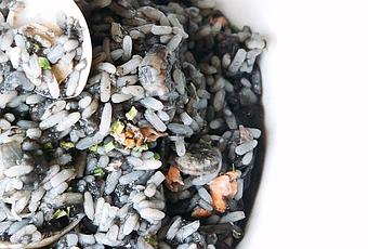 2. Mezclamos el vino con la tinta de negra. Añadimos las gambas, y los calamares al sofrito, sofreímos unos cinco minutos, añadimos el arroz rehogamos un par de minutos, y añadimos el vino blanco, dejamos que evapore un par de minutos, echamos el cilantro y el perejil, cubrimos con el caldo, Dejamos cocer durante 15 minutos, el arroz irá absorbiendo el caldo.