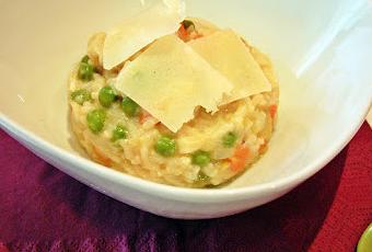 PREPARACIÓN:Lo primero es cortar las verduras en dados pequeños, en una sartén honda ponemos a pochar la cebolla junto con la chalota cuando empiece a transparentar añadimos el puerro, el ajo y la zanahoria. Dejamos cocinar unos 4 minutos hasta que el puerro se ablande.Después incorporamos el calabacín y cocinamos unos 5 minutos, pasado ese tiempo agregamos el arroz y lo mezclamos con las verduras un minuto, vertemos un poco de caldo que tenemos caliente y dejamos cocinar hasta que absorba todo el caldo. Repetimos este proceso unas 3 ó 4 veces removiendo continuamente, después de 15 minutos agregamos los queso y guisantes junto con la mantequilla y la nata, si es necesario incorporamos un poco mas de caldo. Sazonamos con pimienta y nuez moscada.Acompañamos con lascas de parmesano.
