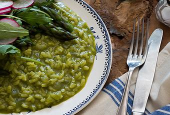 Un risotto con un sutil sabor a verde que lo hace delicioso, me lo imagino ahora que estoy escribiendo el post con unas hojas de hierbabuena picadas por encima y unos guisantitos crujientes y sabrosos decorando junto a la ensalada. Creo que esa va a ser la variación que le voy a hacer cuando repita la receta, así que si pensáis en hacerla, no dudéis en darle ese toque.