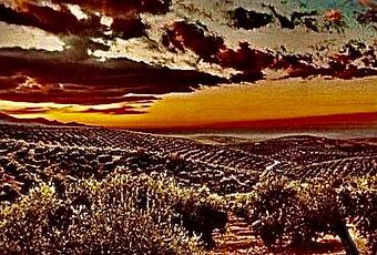 Atardecer sobre un campo de olivos. Fotografía de autor no identificado. Editada.