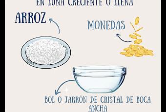 Pones el arroz y las monedas en el bol de cristalCon la mano izquierda remueves el arroz y las monedas, cada día en dirección a las agujas del reloj mientras repites:"Las riquezas del Universo fluyen a mi como la lluvia que cae a torrentes del Cielo"