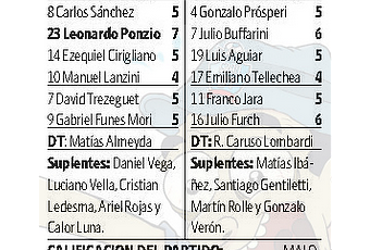 FormacionesRiver (4-4-2): Marcelo Barovero; Gabriel Mercado, Jonatan Maidana, Leandro González Pirez, Ramiro Funes Mori; Carlos Sánchez, Leonardo Ponzio, Ezequiel Cirigliano, Manuel Lanzini; Gabriel Funes Mori y David Trezeguet.Suplentes: Daniel Vega, Luciano Vella, Ariel Rojas, Daniel Villalva, Carlos Luna y Juan Cazares.San Lorenzo (4-4-2): Pablo Migliore; Gonzalo Prósperi, Pablo Alvarado, Nicolás Bianchi Arce, Santiago Gentiletti; Julio Buffarini, Walter Kannemann, Enzo Kalinski, Luis Aguiar; Franco Jara y Julio Furch.Suplentes: Matías Ibáñez, Santiago Gentiletti, Augusto Álvarez, Gonzalo Ramírez, Juan Mercier, Martín Rolle, Héctor Villalba y Fabián Bordagaray.Goles: no hubo.Cambios: ST, 11′ Juan Cazares por Manuel Lanzini (RP), 19′ Daniel Villalva por Carlos Sánchez (RP), 29′ Héctor Villalba por Emiliano Telechea (SL), 39′ Juan Mercier por Luís Aguiar (SL), 41′ Augusto Álvarez por Franco Jara (SL).Amonestados: PT, 23′ Franco Jara (SL), 25′ Gonzalo Prósperi (SL), 45′ Pablo Migliore (SL). ST, 43′ Jonathan Maidana (RP), 43′ Walter Kannemann (SL).Cancha: Estadio Monumental.Arbitro: Germán Delfino