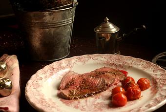 No sé como os gusta la carne, yo nunca o casi nunca pruebo esos tochones enormes de carne que te sirven en una plancha de piedra, que empieza a soltar humo y te deja el pelo con un olor horroroso. Me gusta la carne muy fina por lo que el Roast Beef se adapta perfectamente a mis gustos y a mi pelo, jaja. Siempre se me olvida comprar la carne específica para prepararlo. El ideal es utilizar lomo o solomillo de buey. El otro día compré en la carnicería un redondo de ternera, tenía una pinta estupenda y pensé que no tendría porqué quedar mal sustituir una carne por otra. !!Ojo!!! tiene que ser un redondo que #osprometan que está muyyyyyymuyyy bueno, que la carne es blanda y si es posible que le pongan una malla para que no se deforme. Brujuleando por ahí, encontré la receta de Paula en la que también ha utilizado esta carne, se la he pedido prestada, aunque he hecho algunos cambios.