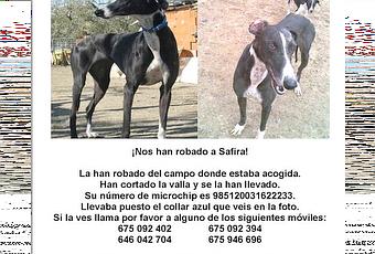 Nos comunican nuestros compañeros de Arca de Noé Sevilla que Safira, una de las galgas que tenían en acogida, ha sido robada la noche del 24 al 25 de abril de 2010.