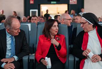 En su intervención, la ministra –que ha llevado en la solapa de su chaqueta un broche regalado por familias ucranianas– ha desvelado algunas anécdotas de los más de 8.000 civiles que España formó para combatir en el frente. «Gente como el General Lara o Sor Lucía son los grandes héroes de la paz. Dais la mano a los fallecidos por la guerra y también transmitís fuerza a los heridos», ha indicado.