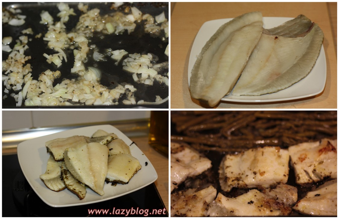 Yo tenía medio rodaballo congelado, que me sobró cuando preparé el rodaballo a la plancha con aceite de rúcula. (Mira aquí la receta) Para esta otra preparación, separamos los dos lomos del medio rodaballo y después dividimos cada lateral en tres o cuatro porciones como las de la foto. Las salpimentamos y las marcamos levemente en la plancha, damos la vuelta antes de que se doren y las colocamos en la fuente, sobre la camita de cebolla y ajopere.