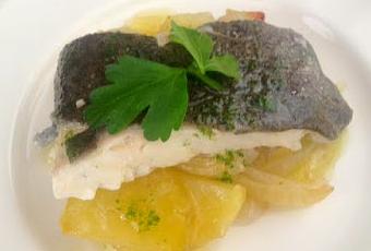 - Se sirve sobre una cama de patatitas y cebolla con el trocito de pescado encima y rociado con un poquito de aceite de perejil. Primero podrás trocear por encima de las espinas y cuando acabes con esa cara le das la vuelta y la cortas por la otra.