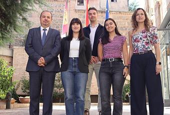 Tres nuevos becarios que se incorporan ahora y que han sido recibidos en Toledo por la directora general de Asuntos Europeos, Nazareth Rodrigo, y por el viceconsejero de Relaciones Institucionales, Javier Vicario.