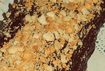 El montaje del brazo de gitano, es el siguiente, extendemos el bizcocho, bañamos con el almibar, extendemos sobre el bizcocho la crema de nueces, con cuidado vamos enrollando, cubrimos el rollo con la cobertura de chocolate, y espolvoreamos almendras picadas.