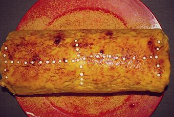 Una vez esté tibio, echamos sobre el roll la crema de yema, espolvoreamos con el azúcar moreno, y caramelizamos con el soplete de cocina. Podeís darle un toque distinto a la yema, añadiendo al almibar un chorrito de licor, whisky o baileys.