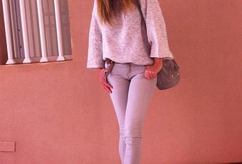 Hice una combinación de diferentes tonos de gris, nuevo máxi jersey/ sudadera, prenda de las que tanto me gustan , sueltas y desenfadas, y rompo con tonos camel y marrón ,dando el toque de color