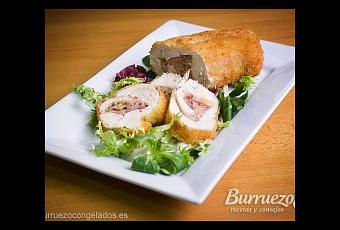 Abrir cada una de las pechugas para conseguir un filete lo más grande posible, salar ligeramente y colocar sobre el papel film desplegado y sin cortar.