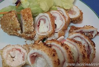 Estira los filetes de pollo, dispon una loncha de jamón y una porción de mozzarella, enróllalos sobre sí mismo.