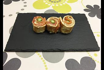 Ingredientes para 6 uds:- 1 huevo- 100gr de salmón ahumado- 1 tarro de crema de queso de oveja fundido con boletus de Quesos Record- 2 espárragos trigueros- Aceite de olivaReceta:- Lava los espárragos, retira el tallo y sécalos bien.- Bate el huevo en un bol.- En una sartén mediana, fríe el huevo formando una tortilla redonda y lo más fina posible. Dale la vuelta para que se cocine por ambas caras.- En otra sartén con unas gotas de aceite de oliva, rehoga los espárragos hasta que estén dorados.- Coloca la tortilla en un plato y extiende la crema de queso de oveja con boletus por toda la superficie de la misma.- Pon encima una capa de salmón ahumado y, en uno de los extremos, coloca los espárragos.- Comienza a enrollarlo por el lado donde has colocado el espárrago.- Corta en varios trozos el rollito y sirve caliente.
