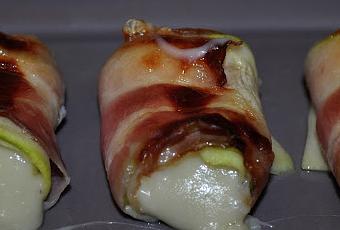 Extendéis una loncha de bacon, ponéis encima una de calabacín, colocáis un trozo de queso y enrolláis.