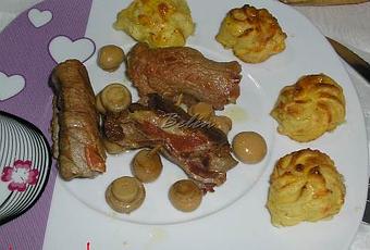 - Servimos los rollitos regados con un poco de salsa, acompañados de los champiñones y las patatas duquesa especiadas.
