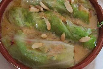 - Hojas de col 2 ó 3 por persona. Voy a poner alguna más por si se rompe alguna.- Carne picada de pavo 150 gr.- Ajos 1.- Cebolla 1.- Pimiento rojo 1.- Miga de pan mojada en leche 60 gr.- Huevos 1.- Caldo de pollo 1 vaso.- Cava semi-seco 1 copa.- Tomillo unas ramitas.- Piñones.- Aceite de oliva 3 cdas.- Pimienta negra molida. - Sal.