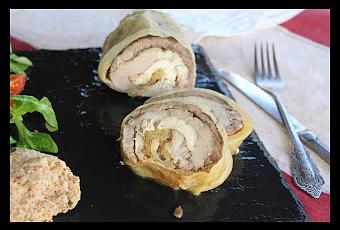 2-Colocar el filete de ternera y espolvorear con especias y sal (tener en cuenta que si utiliza col fermentada es muy salada), poner por encima el filete de cabeza de lomo y terminar con el filete de pechuga de pollo.