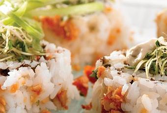 4. Sobre un tapete para hacer sushi extiende una capa de arroz y coloca encima de ella una hoja de alga nori, al centro acomoda los germinados y el surimi, salpícalos con un poco de jugo de limón y enróllalos.