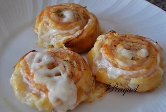 Dos laminas de hojaldreJamón cocidoQueso en lonchas de cabraUn huevoOrégano Preparación:Extendemos la lamina de hojaldre, ponemos encima las lonchas de jamón si que monten una con la otra.Después hacemos lo mismo con el queso y enrollamos la masa con el relleno.