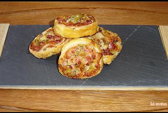 Precalentar el horno a 180 grados.Estirar el hojaldre fino en forma rectangular.Cortamos el queso y el jamón en juliana, laminamos las aceitunas, y extendemos todo esto sobre las láminas de hojaldre.