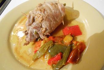 Fue una intuición que me vino hace unas semanas. El resultado fue excepcional, incluso la guarnición: unos pimientos asados muy sabrosos (aquí la receta).