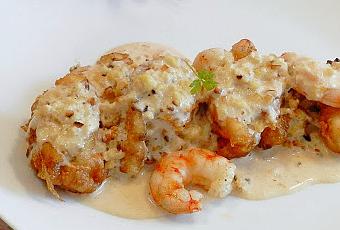 Servimos los rollitos de lenguado y los gambones con la salsa de almendras. Y a disfrutar!!