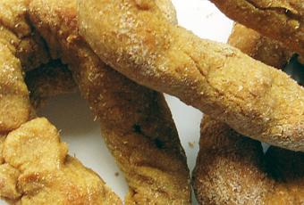 Coge porciones de masa, del tamaño que desees, dales forma de rulo alargado y une los dos extremos. Colócalos en una bandeja de horno con papel sulfurizado si vas a hornearlos.