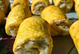 - En un bol mezclamos la harina, la cúrcuma, el aceite y la sal; revolvemos mientras se incorpora el agua en pequeñas cantidades hasta lograr una masa blanda que no se pegue en las manos. Espolvorear harina sobre la superficie de amasar y estirar la masa con ayuda de un rodillo dándole un grosor de 3 mm aproximadamente. Extendemos el relleno en forma uniforme, enrollamos la masa con las dos manos sobre sí misma, como si fuera un canelón.