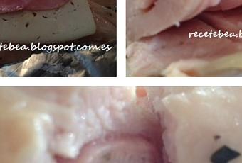 Abrimos bien la pechuga cortandola lo máximo que podamos. Colocamos la loncha de queso encima de la pechuga y encima la de jamón. Envolvemos bien prieto y gratinamos durante 10 '. Impregnamos con perejil.
