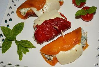Cortamos las lonchas de queso fundido por la mitad y las vamos colocando sobre sobre los cuartos de pimiento. Cubrimos con una capa fina de la mezcla de queso preparada y los enrollamos sobre si mismos, sujetándolos con un palillo de madera.