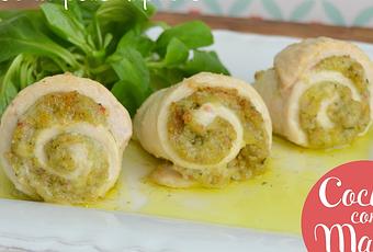 2. Disponemos los filetes de pollo, extiende una capa de pesto y haz un rollito. Parte cada rollito por la mitad, de modo que el corte es lo que va a quedar bonito al hornearse.