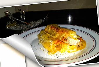 Sobre la encimera colocaremos las placas y las cortaremos por la mitad y las rellenamos con la mezcla de pollo que hemos preparado.Colocaremos en una bandeja para horno una capa de rollitos, cubriremos con crema y encima la mitad del queso parmesano rallado. Añadiremos la segunda capa de rollitos y cubriremos con el resto de la crema y el queso parmesano. Los hornearemos a 180º C unos 15 minutos aproximadamente.