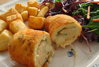 Preparación:1. Lavamos bien los filetes de pollo. Colocamos los filetes estirados en un plato y espolvoreamos con perejil. Ponemos unos trocitos de queso encima y enrollamos los filetes ayudándonos con un palillo para sujetarlas al final impidiendo que se nos abran.