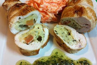 Se extienden las pechugas de pollo y se rellenan con esta farsa. Se enrollan y se atan con hilo bramante formando un rulo o rollo.
