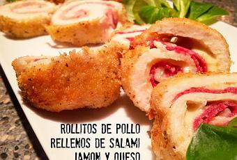 2. Colocamos sobre cada filete las lonchas de queso (asegurando que no sobresalgan por los bordes) Yo hice un variado: 2 lonchas de jamón y en otros dos filetes las rodajas de salami. Ahí ya al gusto de cada cual.