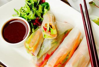 Ingredientes para 16 rollitos: 16 obleas de papel de arroz½ pimento rojo½ pimiento verde carnoso1 zanahoria½ pepino1-2 aguacates100 gr. de salmón ahumado Para la salsa agridulce: 150cc de zumo de piña2 c/s de vinagre de arroz2c/s de ketchup1 c/s rasa de azúcar moreno1c/s de salsa de soja½ c/c de Jengibre en polvo