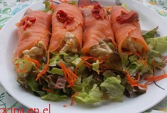 - Extendemos las lonchas de salmón y en cada una de ellas ponemos una cucharada de ensaladilla.