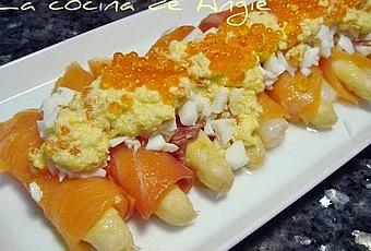 Esta receta la vi hace tiempo en una revista, es un aperitivo muy rico. Se la voy a dedicar a Manderley (Guindilla y canela) por el premio Blog brillante que me ha otorgado. Pasar por su blog y veréis cuántas cosas buenas. Gracias, Manderley, espero que te guste!- Escurrir una lata de espárragos. Enrollar 2 ó 3 (según el grosor) con una loncha de salmón ahumado y cortar a la mitad. Cocer 1 huevo, pelarlo y separar la clara de la yema. Picarlas por separado. Espolvorear los espárragos con la clara picada.