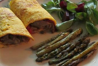 Preparamos las tortillas, 2 huevos para cada rollito. Batimos los huevos y agregamos sal. Ponemos en una sartén con un chorrito de aceite de oliva y, cuando esté hecho por un lado, con ayuda de un plato, le damos la vuelta y la hacemos por la otra cara. Una vez listas las tortillas, procedemos a ponerles el relleno y las enrollamos.